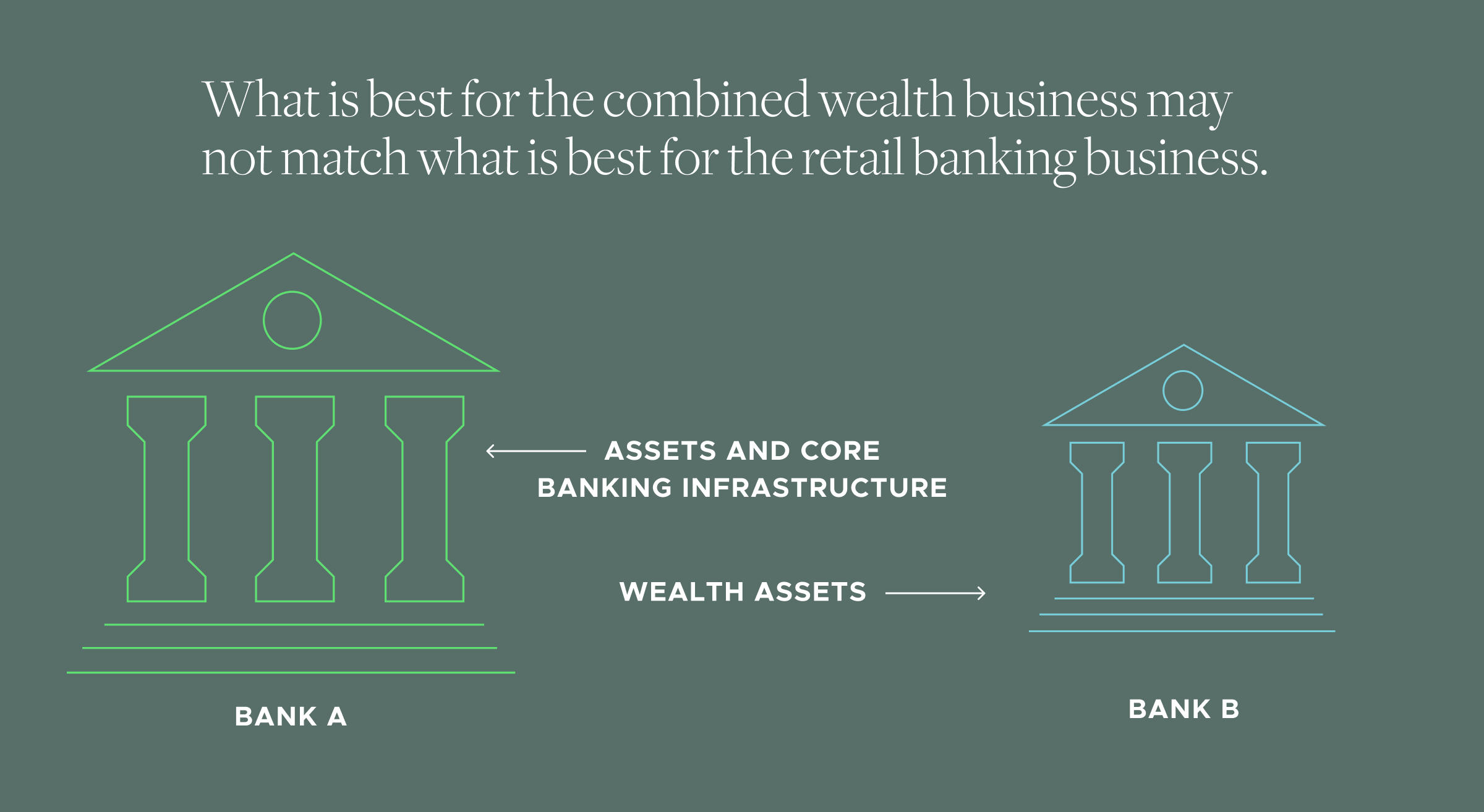 In this scenario, achieving the best outcome for the combined wealth businesses means the new bank would move assets and the core banking infrastructure onto Bank A's platform, but move wealth assets to Bank B’s platform.